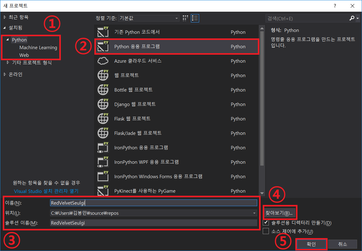 - 만약 프로젝트 위치가 마음에 들지 않는다면 '찾아보기' 버튼을 눌러 변경할 수 있습니다.