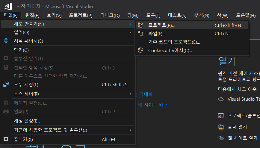 왼쪽 상단 메뉴에서 [파일] -> [새로 만들기] -> [프로젝트] 를 눌러주세요.