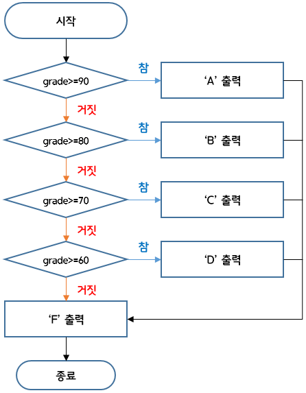 예제에서 시험 성적에 따라 학점을 부여하는 것을 이러한 구조를 사용하여 코딩하면 됩니다.
