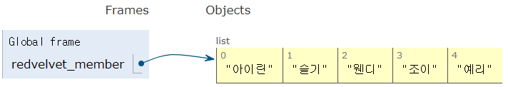 redvelvet_member = ["아이린", "슬기", "웬디", "조이", "예리"]
