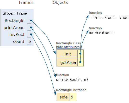 정사각형을 클래스 Rectangle로 정의하였습니다. 클래스 Rectangle은 side 변수와 getArea() 메소드를 가지고 있습니다. Rectangle의 객체를 생성하고 이것을 printAreas() 메소드에 전달하였습니다.