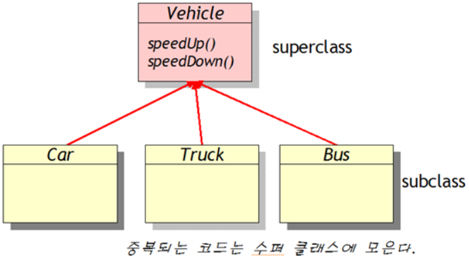 2. 상속을 사용하면 중복되는 코드를 줄일 수 있습니다. 예를 들어서 승용차, 트럭, 버스는 모두 속도를 변경하고 방향을 바꾸는 기능을 가지고 있습니다.
