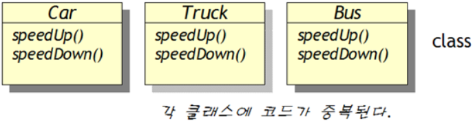 이들은 속도 변경 메소드 setSpeed() 와 방향 변경 메소드 turn() 으로 구현될 것이고, 이들 클래스를 독립적으로 작성하게 되면 setSpeed()와 turn()은 모든 클래스에 중복해서 포함될 것입니다.