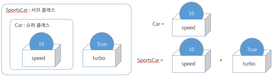 1. 구체적인 예를 들어봅시다. 스포츠카는 일반적인 자동차의 특징을 모두 가지고 있고 추가로 터보 차저(turbo)가 추가되어 있다고 합시다.