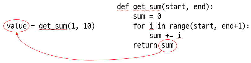 아래와 같은 문장에서 get_sum(1, 10)은 반환값 55로 대체됩니다. 따라서 변수 x에 55가 저장되는 것입니다.