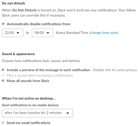 - Sound & appearance : Slack 알림이 올 때 메시지를 미리 볼지에 대한 여부와 소리 제어를 할 수 있습니다.