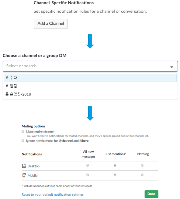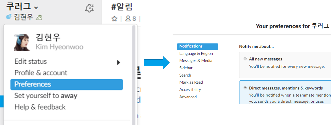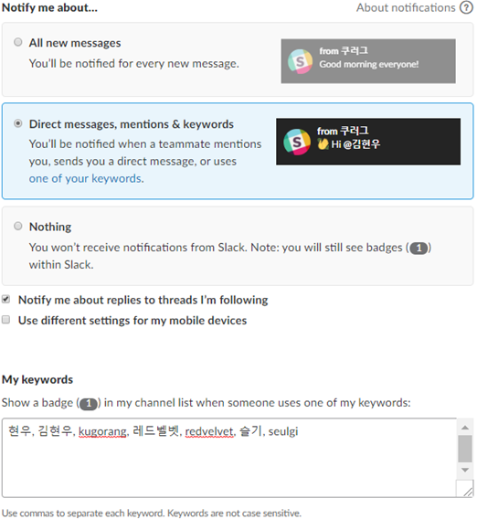 - Direct messages, mentions & keywords : 1:1 대화, 언급(ex. @kugorang) 또는 키워드에만 알림을 받습니다.