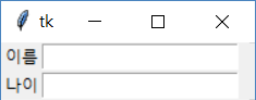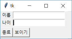 print("이름 : %s\n나이 : %s" % (e1.get(), e2.get()))
