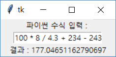 수식을 텍스트로 입력하면 이것을 계산하고 그 결과를 출력할 수 있는 간단한 계산기를 작성하여 봅시다. 수식의 형태는 파이썬과 동일하여야 합니다.