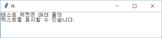 T.insert(END, "테스트 위젯은 여러 줄의\n텍스트를 표시할 수 있습니다.")